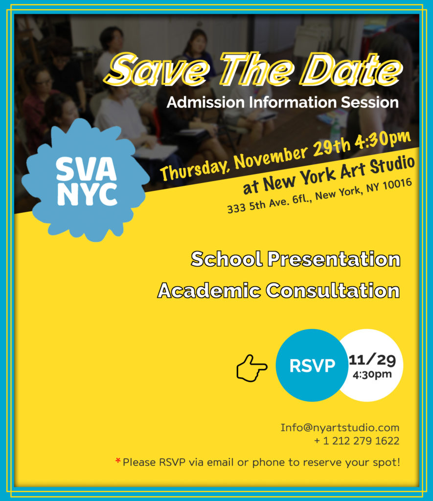 Hear ye hear ye! At New York Art Studio, we are hosting another information session by SVA on THURSDAY, NOVEMBER 29TH! at NEW YORK ART STUDIO, 333 5th Ave. 6th Fl. New York, NY 10016. Not only is it one of the top art schools in NYC, SVA is also well-renowned throughout the nation and–might […]