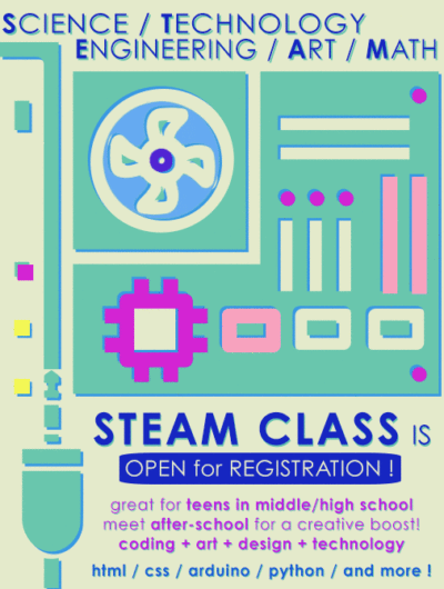Our AFTER SCHOOL STEAM PROGRAM  for upcoming spring is OPEN FOR REGISTRATION! The program will be all about creative exploration and experiment in technology and art combined, and is recommended for middle to high school students, who are interested in technology, art, design, and more! Students will think, talk about, and develop hands-on different projects that traverse a variety of disciplines, […]