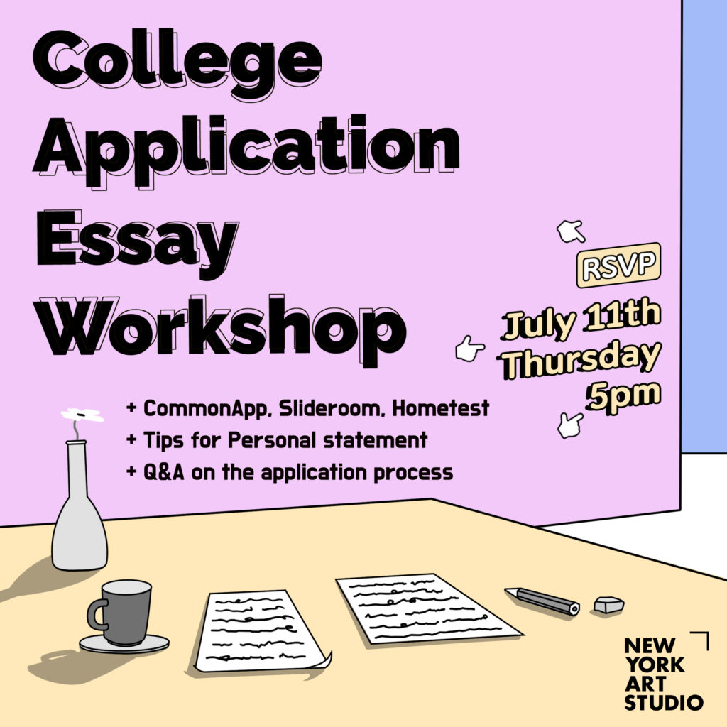 RSVP now to reserve a seat! Learn about the tips and strategies in applying to art colleges! + Common App / Slideroom / Home Test + + Essay Writing Tips + + Q&A on the Application Process +