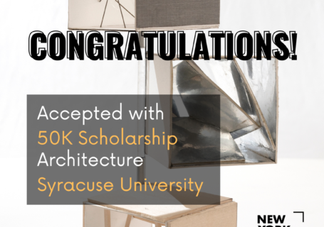 Congratulations ! Our student in the Art College Portfolio Prep course has been accepted to Syracuse University‘s Bachelor’s Architecture program with scholarships of $50K! Having grown up in two different cultures, the student was interested in how architecture could be influenced by geography and culture. The portfolio shows a good mix of sculpture, architecture drawing, […]